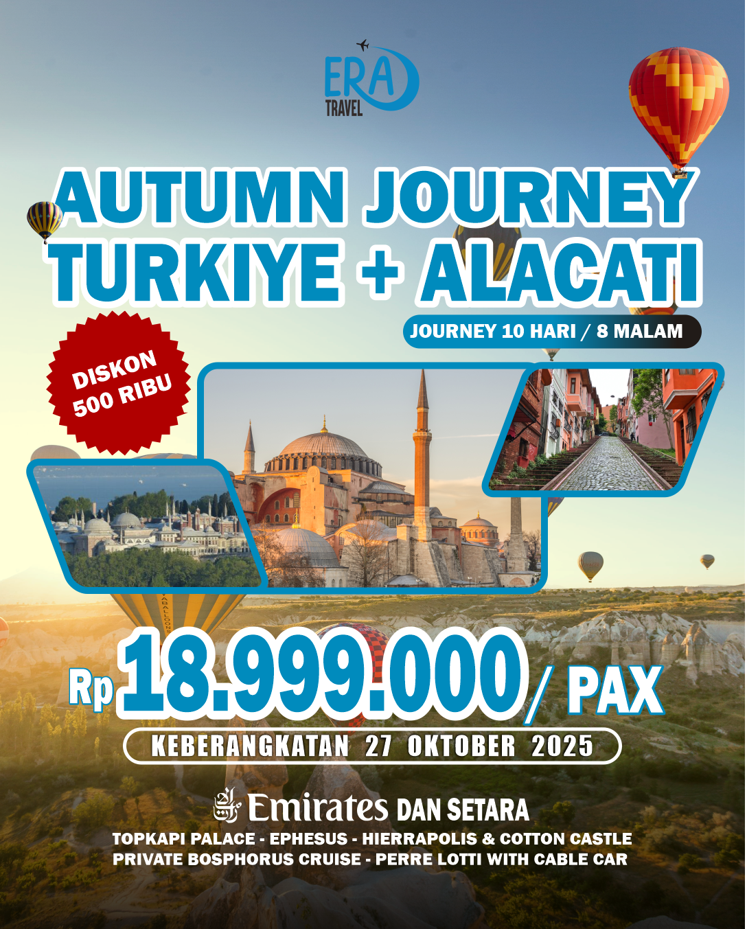 Embark on an unforgettable journey to Turkey with Eraventure, where ancient civilizations meet vibrant modern life. Wander through the bustling streets of Istanbul, marvel at the architectural wonders of Hagia Sophia and the Blue Mosque, and drift above Cappadocia’s surreal landscapes in a hot air balloon. Our curated trip combines rich history, breathtaking scenery, and unique cultural experiences, ensuring your adventure is safe, seamless, and truly memorable.